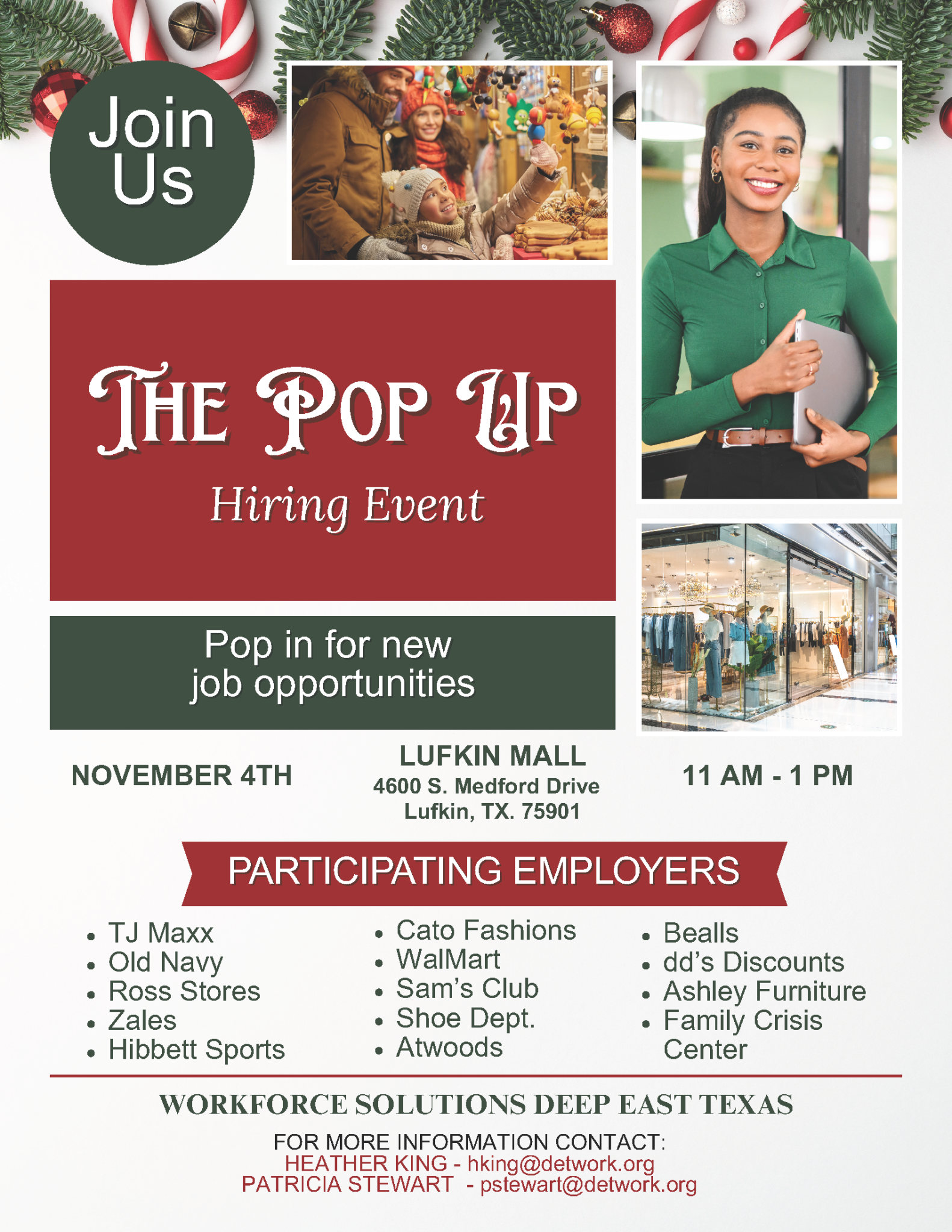 The Pop-Up Hiring Event will take place at the Lufkin Mall, 4600 S. Medford Drive, Lufkin, from 11:00 a.m. to 1:00 p.m.